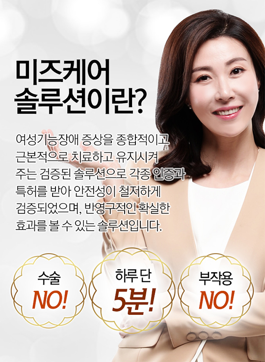 미즈케어 솔루션은 여성의 성기능 개선은 물론 요실금, 불감증 등 수술적 요법이 아닌 운동법으로 늘어지고 헐렁해진 질근육과 골반기저근육을 강화시켜 강한 질수축 효과로 100% 천연요법으로 진행이 된다고 해요.
