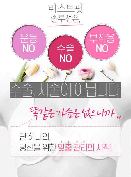 수술이나 침 등 직접 병원에 방문을 할 필요 없이 집에서 쉽고 간편하게 솔루션 진행이 가능하며 절벽가슴, 짝가슴, 벌어진 가슴을 비롯해 출산과 다이어트로 인하여 처지고 작아진 가슴에 대한 고민을 가진 여성들에게 합리적인 솔루션을 제공합니다.