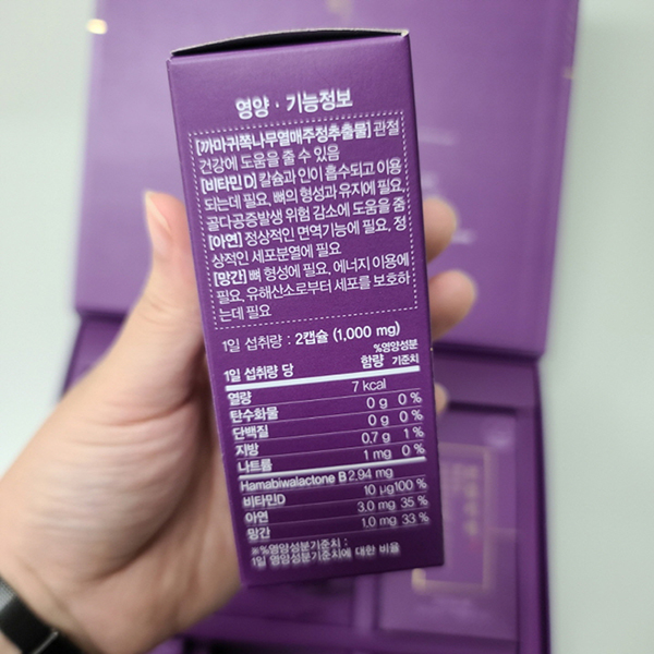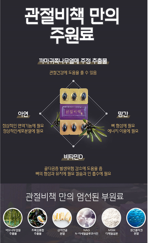 관절통증개선, 연골조직의 유연성, 항염작용의 개별인정형 원료인 까마귀쪽나무열매추출물과 비타민D,아연,망간을 주성분으로 한, 중장년층의 관절 및 뼈 건강,면역까지 고려한 9가지 복합기능성 ~♥
