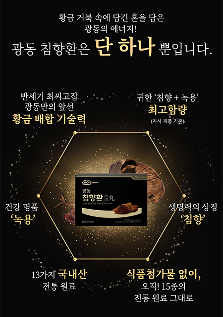 광동 침향환은 세계 3대 향 중 하나 노쇠를 극복하는 고귀한 침향과 녹용, 14가지 국내산 전통 원료를 반세기 최씨고집 광동만의 앞선 황금 배합 기술력으로 탄생한 제품이라고 해요.